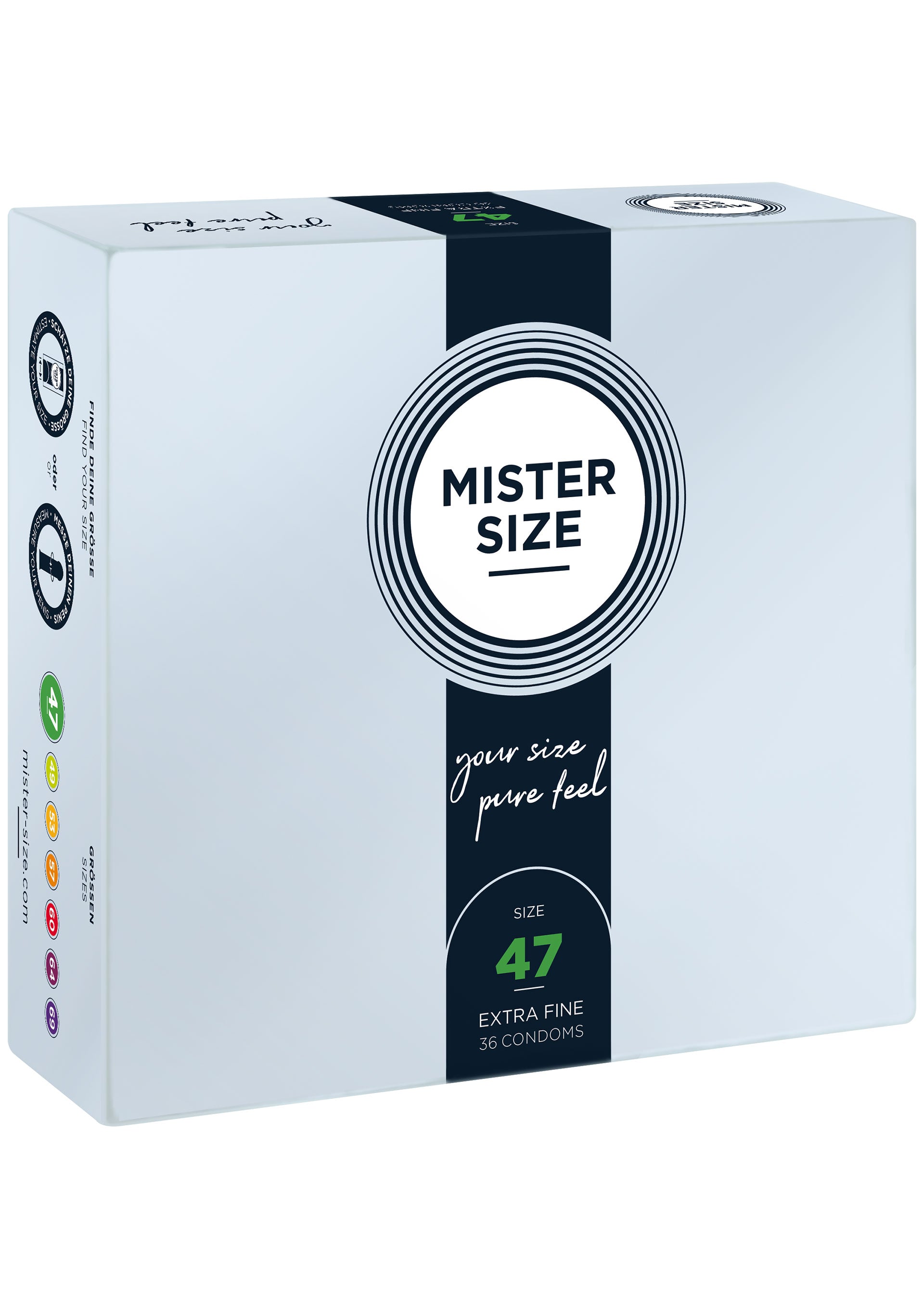 MISTER SIZE - pure feel 47mm (36pieces), the condom for the slim and sporty penis. Ultra-thin (0.05 mm) - for pure intensity.