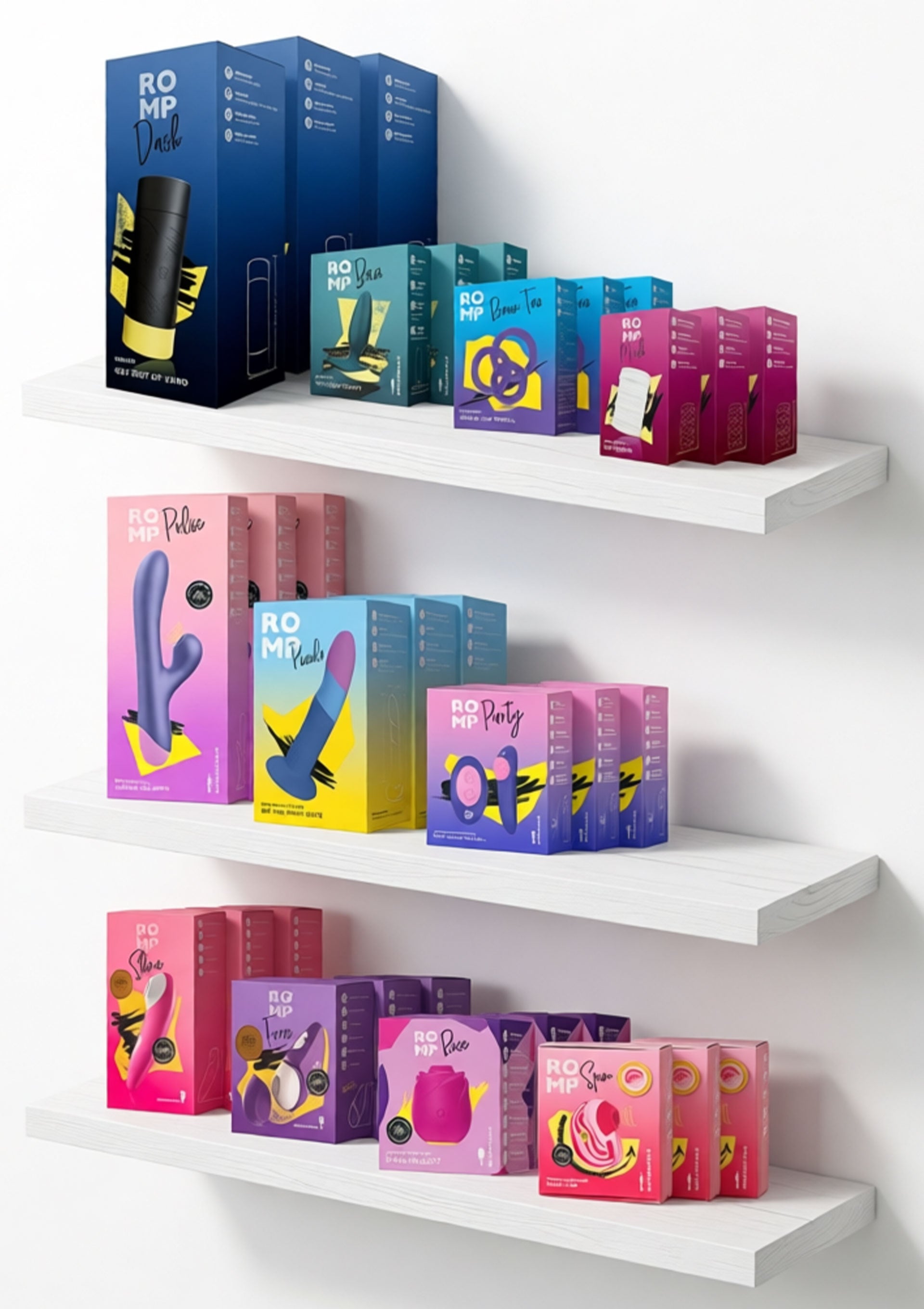 Ready to Romp! Sexual satisfaction comes in all shapes and sizes and ROMP embraces every single one of them. By making sex toys available to everyone, we‘re helping people explore their curiosity with confidence. ROMP’s products are carefully designed to meet the highest standards, all while retaining a fun and fresh vibe. Why choose ROMP? Quality and Technology from leading sex toy manufacturer | Pleasure Air Technology by Womanizer | Young target group – grow them into buying more | Entry level product, cover the lower price segment | Colorful – ROMP stands out.