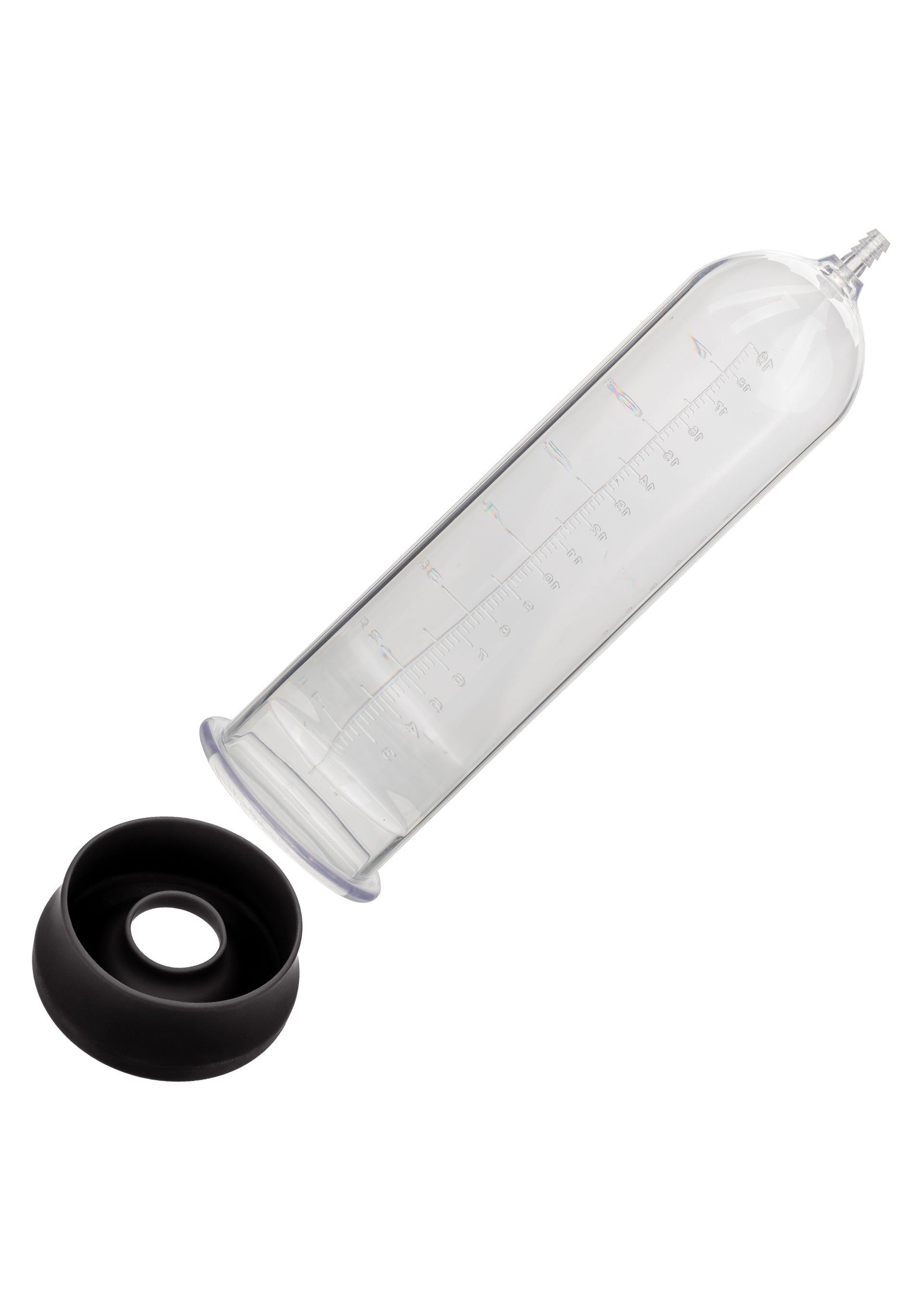 The Magnified Gauged Pump System includes a pressurized pump and a liquid silicone cock and ball dual enhancer ring. The pump has a built-in PSI gauge for safe pressure control and a magnified cylinder with measurement marks to track progress. It includes a flexible air hose, easy-squeeze pistol grip, and a pressure release trigger valve for quick relief. The tapered silicone donut improves comfort and helps create a strong seal. The pump disassembles for easy cleaning. A complete kit for performance support and added enhancement.