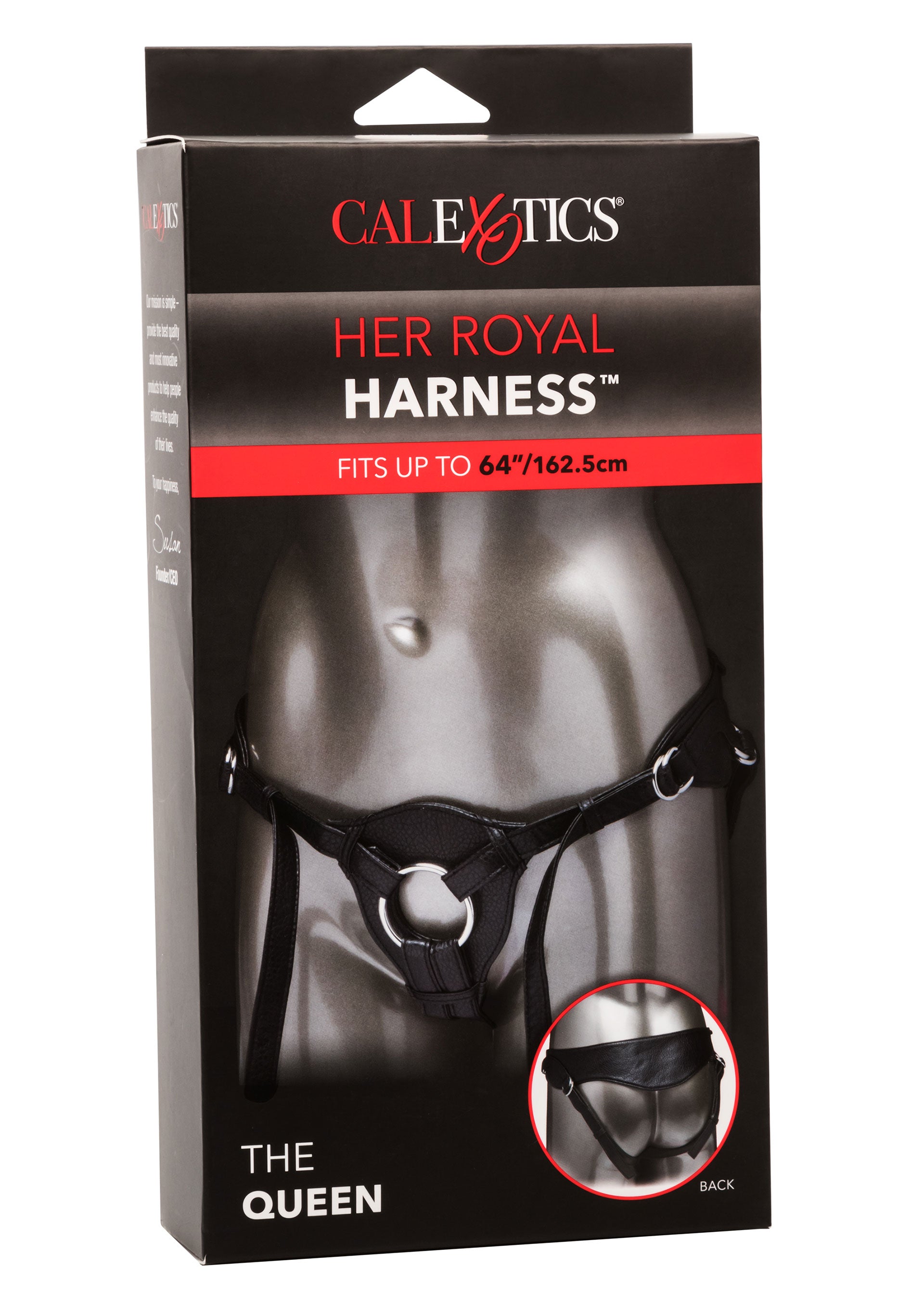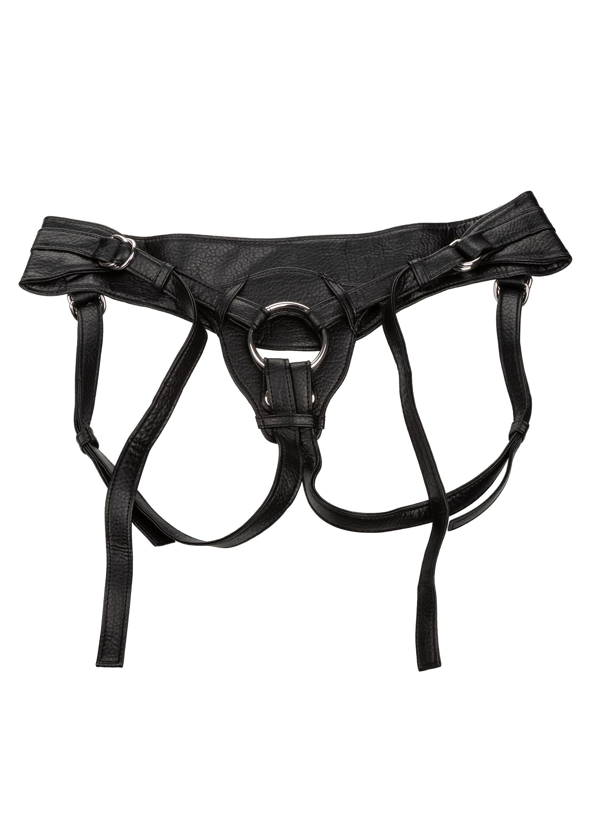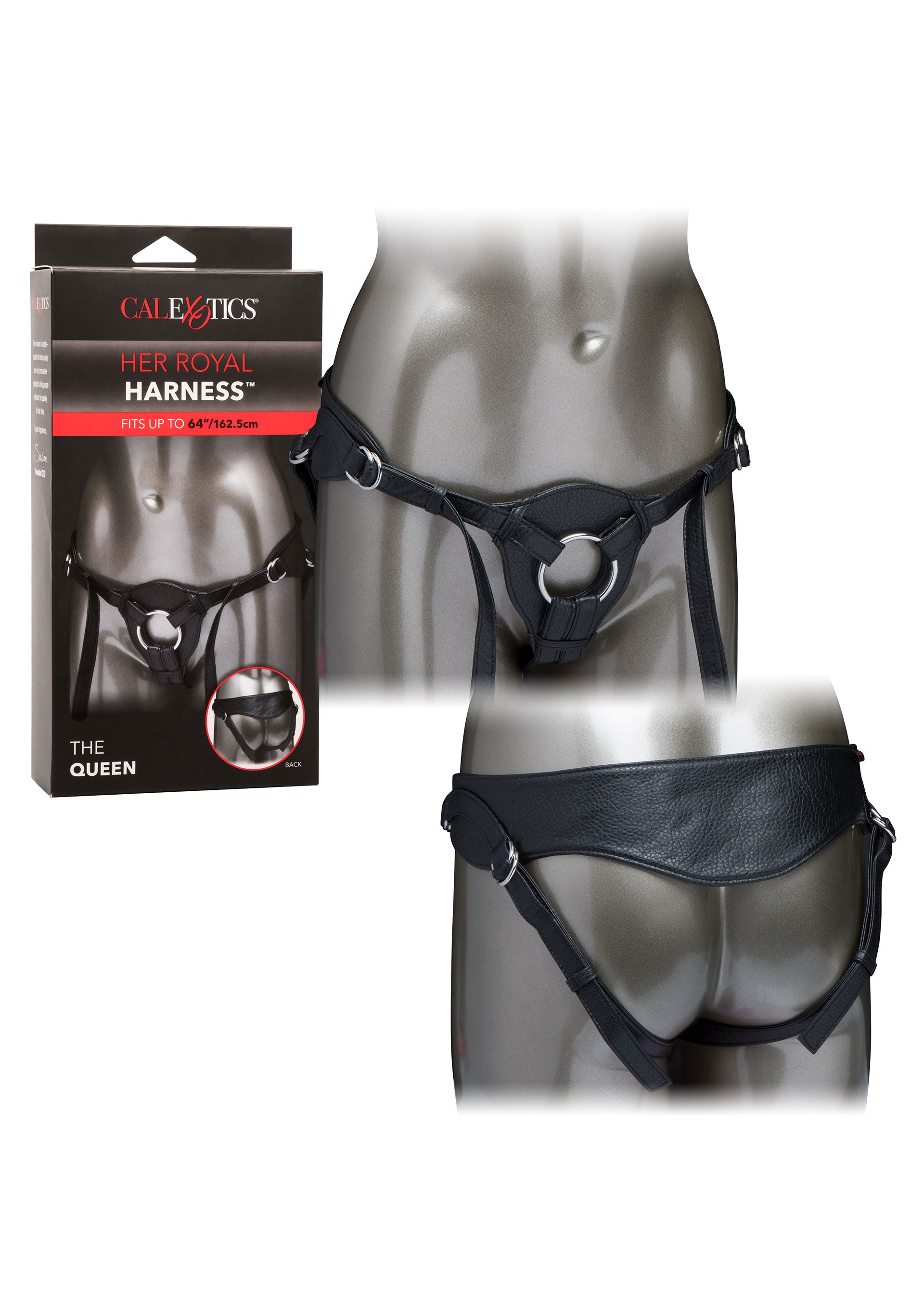 Prepare yourself for thrilling pleasure and premium probe play truly fit for royalty with The Queen. Her Royal Harness’ luxurious harness is made for a performance and comfort with lower back support strap, adjustable fit and sturdy reinforced stitching. The sleek crotchless design appeals to even the most dominant with the discreet snaps made to accommodate any size probe ring. The double-layer vegan leather and adjustable thigh and waist straps give you the ultimate control over comfort.Surrender yourself to your most carnal fantasies and dive deep into erotic pleasure whenever you slip into this fashion-forward harness. The fully adjustable waist fits up to a 64” Waist (162.5 cm) and the interchangeable O-ring accommodates most probes with a diameter of 2” (5 cm).