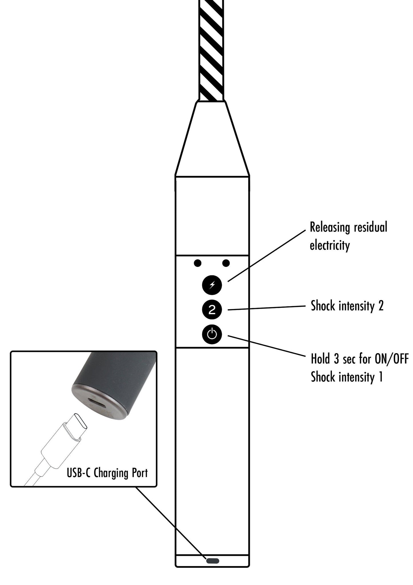 The Electro Shock Cane delivers shocks through the middle section of the cane only, the metal tip at the end does not conduct electricity. This cane is not waterproof. Do not immerse it in water to avoid damage. When cleaning, use a damp cloth.