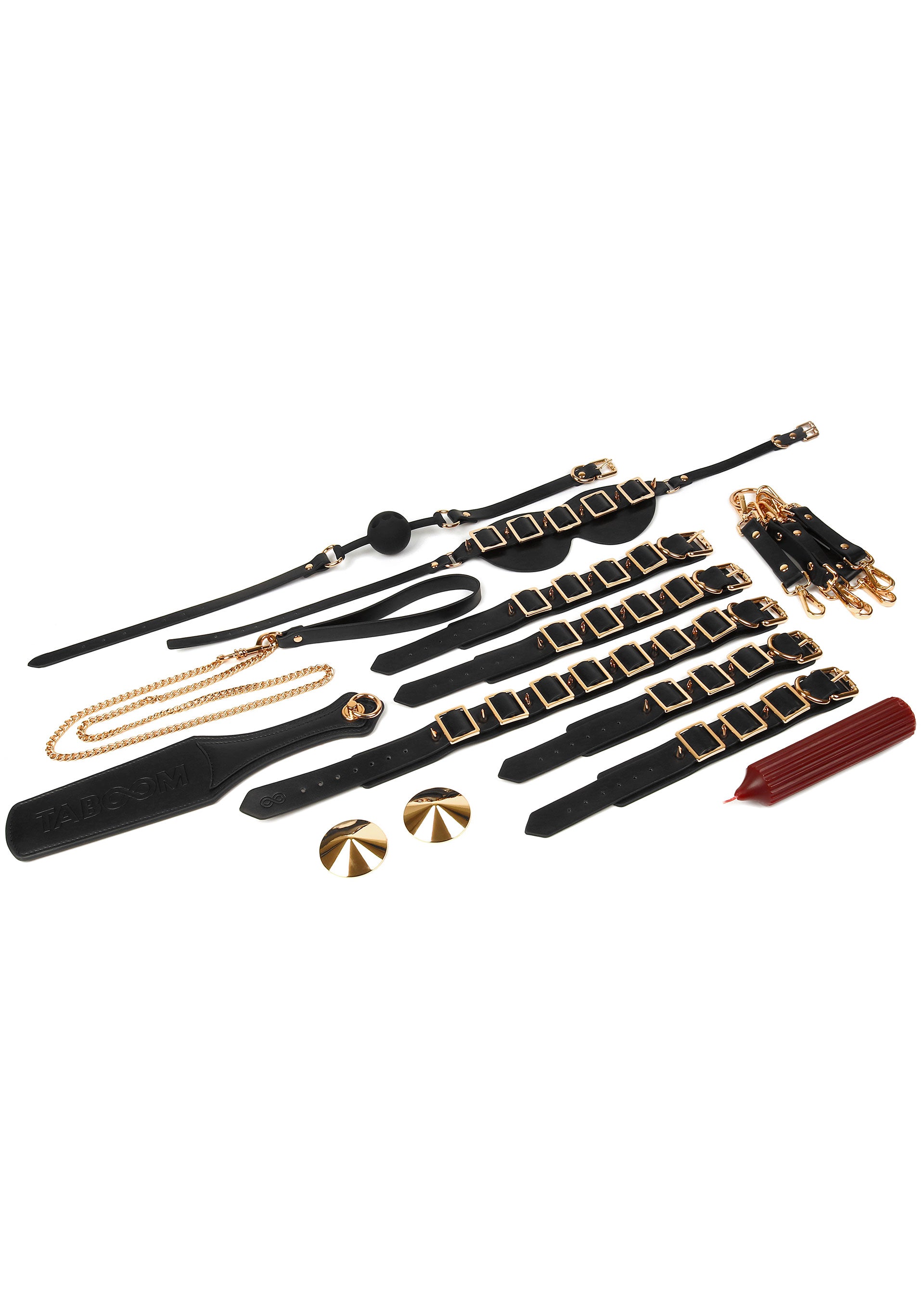 Unlock your deepest fantasies with TABOOM Desires Masterpiece Suitcase – a unique collection of 11 exquisite bondage essentials designed for couples ready to explore new heights together. Inside the eye-catching suitcase, you'll find a seductive collar with leash, elegant handcuffs and wrist cuffs, a sensual blindfold, teasing ball gag, smooth paddle, alluring nipple covers, and a BDSM drip candle to heat up every moment.