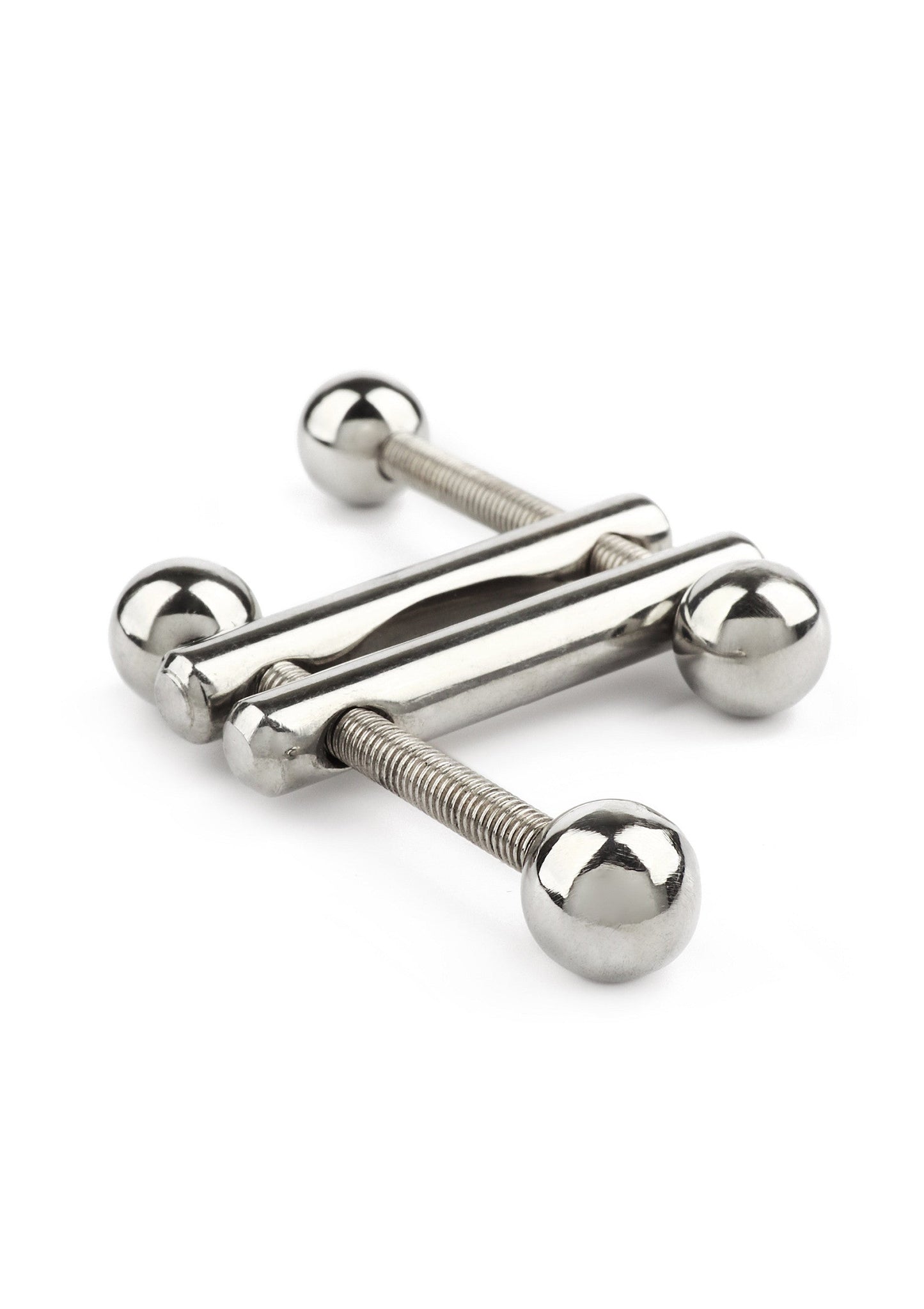 The Mr. Steel Nipple Clamps offer an intense and adjustable nipple play experience. Crafted from high-quality stainless steel, these clamps apply firm and even pressure, enhancing sensitivity and stimulation. The adjustable screw mechanism allows users to control the level of compression, making them suitable for both beginners and experienced BDSM enthusiasts. The smooth, polished surface ensures comfort while maintaining a secure grip. Whether used for light pinching or more intense sensation play, these clamps are designed to deliver heightened pleasure and restraint. Perfect for those exploring endurance and control in their sensory play. Always clean thoroughly before and after use for hygiene and safety.