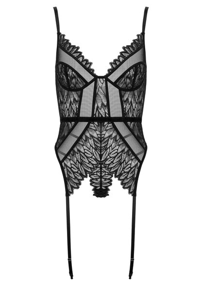 This black corset set is an absolute eye-catcher: delicate leaf-pattern embroidery, sheer mesh panels, and seductive cut-outs create a stunning silhouette. The soft cups offer light support and, together with the adjustable straps, ensure a comfortable and flattering fit.