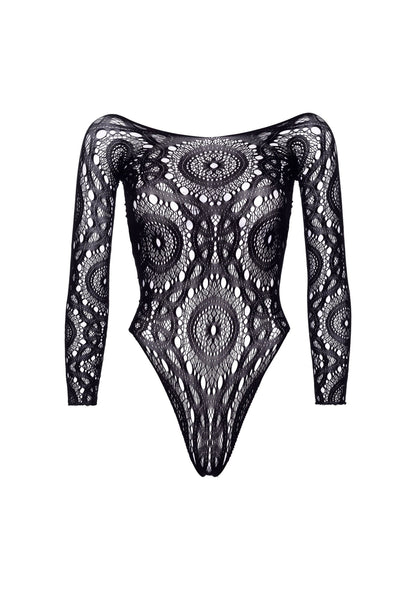 Crochet lace long sleeved snap crotch thong back teddy with a low back.