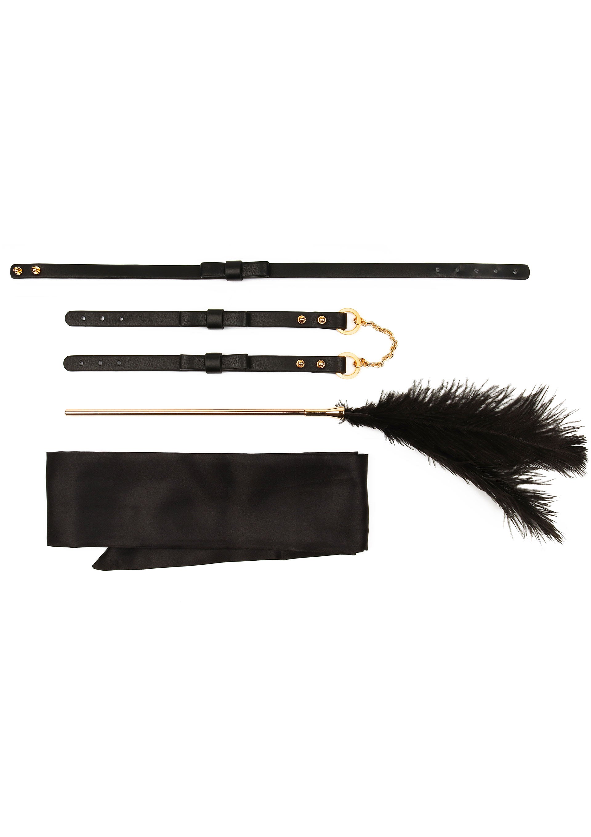 Dive into the thrill of playful temptation with the 4 PCS TABOOM Desires Tease Bondage Set – complete with a seductive collar, flirty wrist cuffs, silky bondage ribbon, and a feather tickler that teases with every tempting touch.