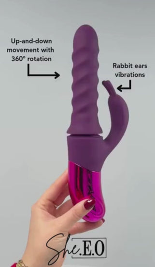 She.E.O presents the Swirl Rabbit Thrusting Vibrator, a groundbreaking pleasure toy designed for women who crave deep, rhythmic stimulation. The Swirl's insertable shaft delivers an extraordinary sensation by thrusting up and down while rotating 360° around its axis. This vibrator features 5 different rotating modes: two that rotate to the left, two to the right, and one that alternates between both directions. It also offers 5 thrusting intensities, delivering powerful, lifelike movement that'll take your pleasure to a whole new level.