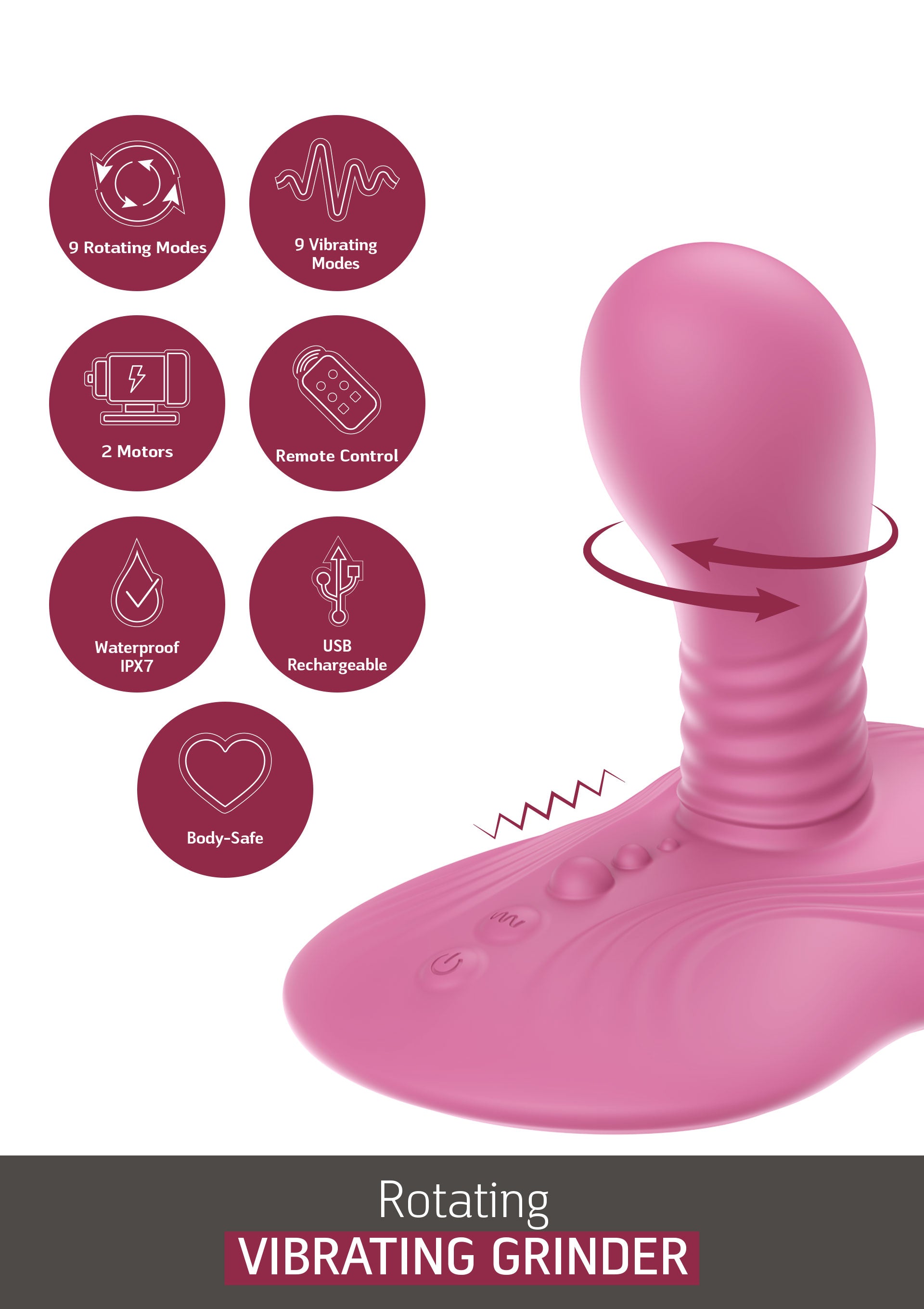 The She.E.O Rotating Vibrating Grinder is designed for focused external stimulation with added internal sensation. The rotating shaft creates a smooth, rhythmic motion, while the base delivers deep vibrations to stimulate the vulva and clitoris. Two powerful motors work independently, offering 9 vibration modes and 9 rotating modes for a wide range of sensations. You can use them separately or combine them for a more intense experience. The included remote control allows easy adjustments or shared control. The compact, ergonomic shape fits comfortably against the body for hands-free use. The textured surface enhances stimulation with every movement. Made from body-safe silicone, it feels soft and smooth on the skin. Fully USB rechargeable and IPX7 waterproof, it is suitable for both bedroom and shower use.